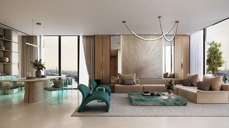 An impressively curated collection of homes from 216 modern studio apartments and 363 refined one-bedroom residences to 42 well-appointed two-bedroom layouts, and a single superlative offer of three bedrooms. It is the only curved building in Dubai and will allow each home to have a broad view of man-made marina clubs, plaza water features, palm shaped garden as well as some of the marina from one side. The layout makes a secluded, tranquil oasis in the middle of it. The facade is of glass and a contrasting grid pattern, creating a sharply modern appearance.