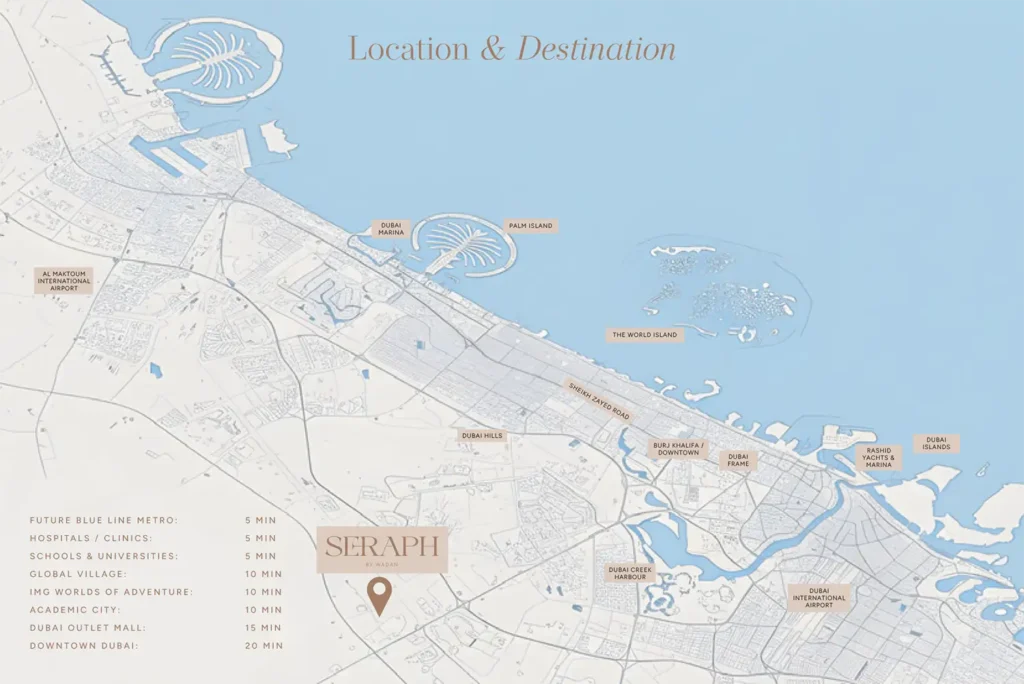 Seraph by Wadan Developments is an emerging sanctuary born of elegance and sophistication in Dubailand (DLRC), including chic studios, 1, & 2-bedroom apartments. This mid-rise jewel stands with a quite impeccable architecture defined by clear lines, flowing design of terraces, and a transparent glass facade that reflects the lush green and vibrant suburban beauty of the surroundings. It is a vibrant enclave that blends natural elements of greenery, breathtaking views, and spacious layouts with a sense of openness. Offering a vision beyond luxury, this address features an exclusive range of amenities with smart home and premium technology in the open and green landscaped setting of the city.